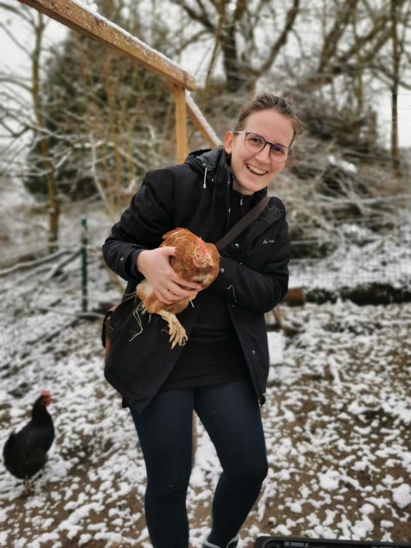 Svenja aus der Nähe von Nürnberg vermittelt zusammen mit Bianca unsere geretteten Hennen und fährt auch die Sammeltransporte nach Bayern. Die Tierschutzaktivistin hat selbst einen geretteten Hund und hilft in ihrer Freizeit gerne auf Lebenshöfen aus.
