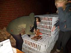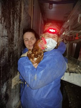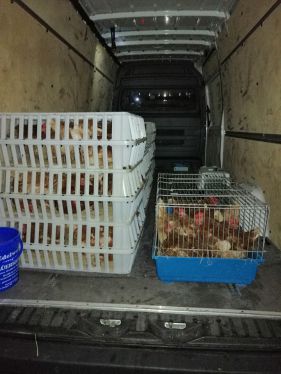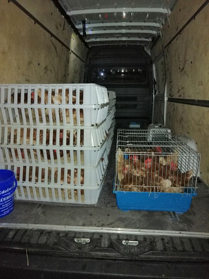 Diese Rettung hatte aber einen ungewöhnlichen Anfang: Als wir gerade mit der Ausstallung beginnen wollten, fuhr plötzlich eine Polizeistreife zum Betrieb. Der Beamte und die Beamtin ließen durchblicken, dass Anwohner dachten, wir wollen die Hennen stehlen. Glücklicherweise war der Betreiber telefonisch erreichbar, als wir versuchten, ihn zu kontaktieren. So konnte die Ausstallung dann nach kurzer Verzögerung doch planmäßig stattfinden. Etwas später erfuhren wir, dass wohl 10 Einsatzwagen wegen uns angefordert worden waren!